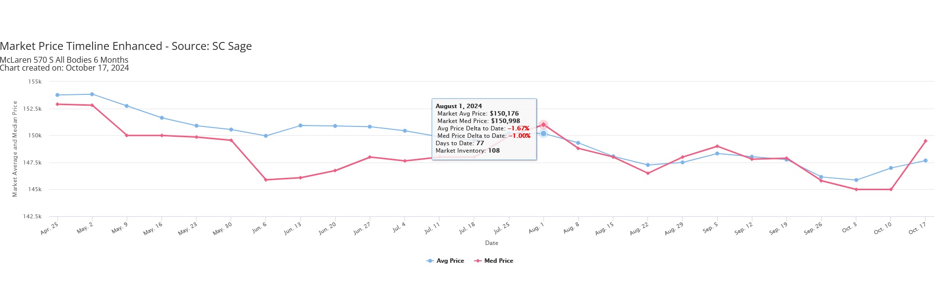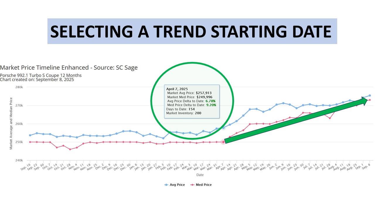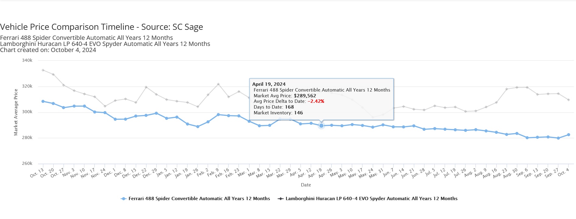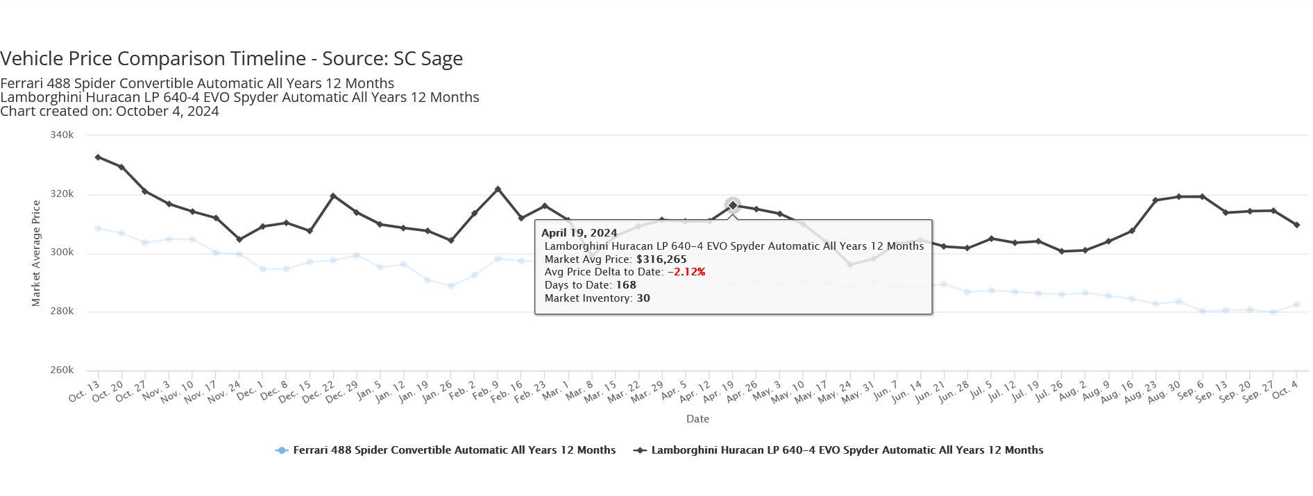 Get market average and median price trends for over 150 Ferrari, Lamborghini, McLaren and Porsche models in the SC Sage database with this enhanced price trend chart. There is no other price trend chart from any source which is as statistically robust and as current with source data updated daily.
