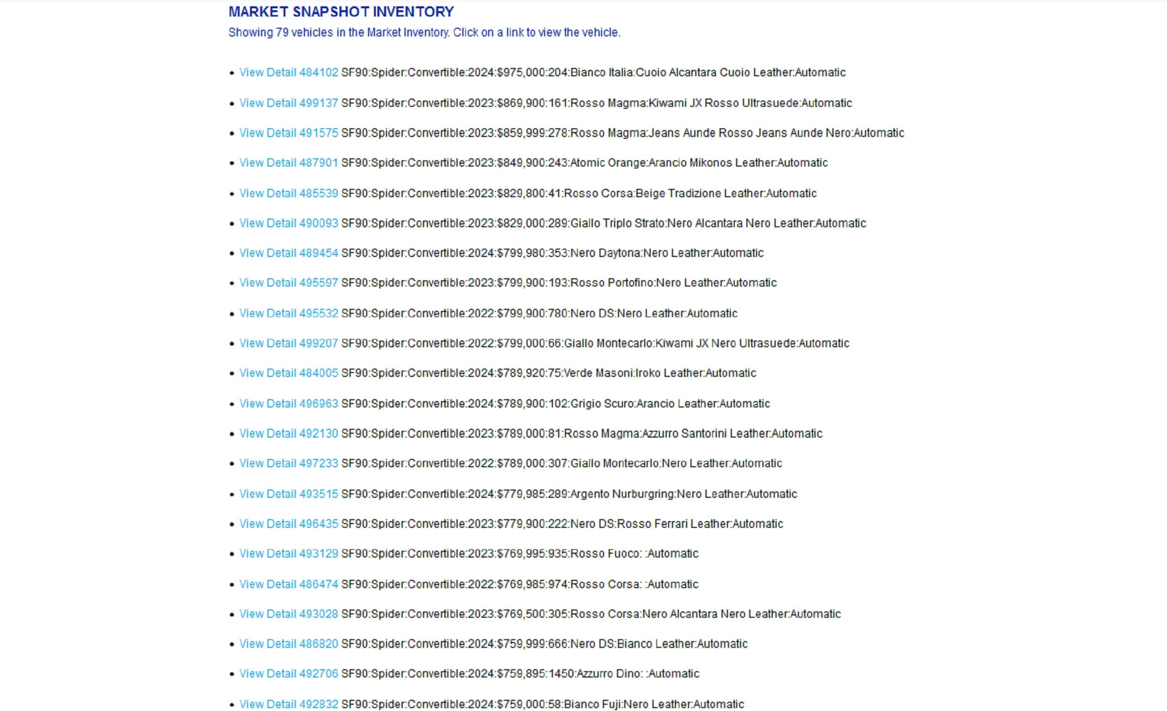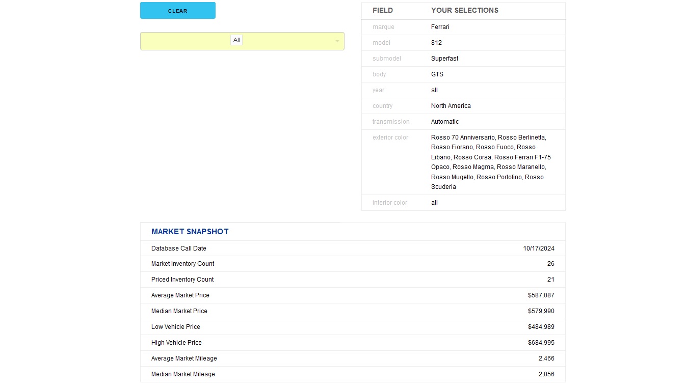The Market Inventory app pulls all, or priced only, market inventory by VIN or by matching a submitted specification. The inventory is listed from highest price to lowest price with each vehicle featuring a one-click link to the Vehicle Page app. It uses the inventory data set to filter in vehicles with price and mileage and it uses this filtered inventory to generate price and mileage stats similar to the Market Value app.
