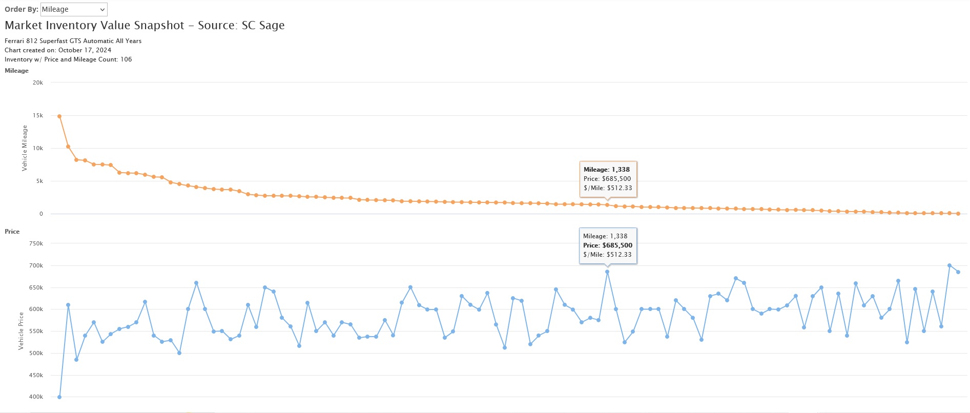 Understand the landscape of the current market inventory for over 150 Ferrari, Lamborghini, McLaren and Porsche models in the SC Sage database. Vector mileage, price or $/mile to identify where any vehicle fits into the current market. From this unique and proprietary chart with one click you can view the matching Market Inventory app or any specific VIN in the Vehicle Page app. The chart’s source data is updated daily.