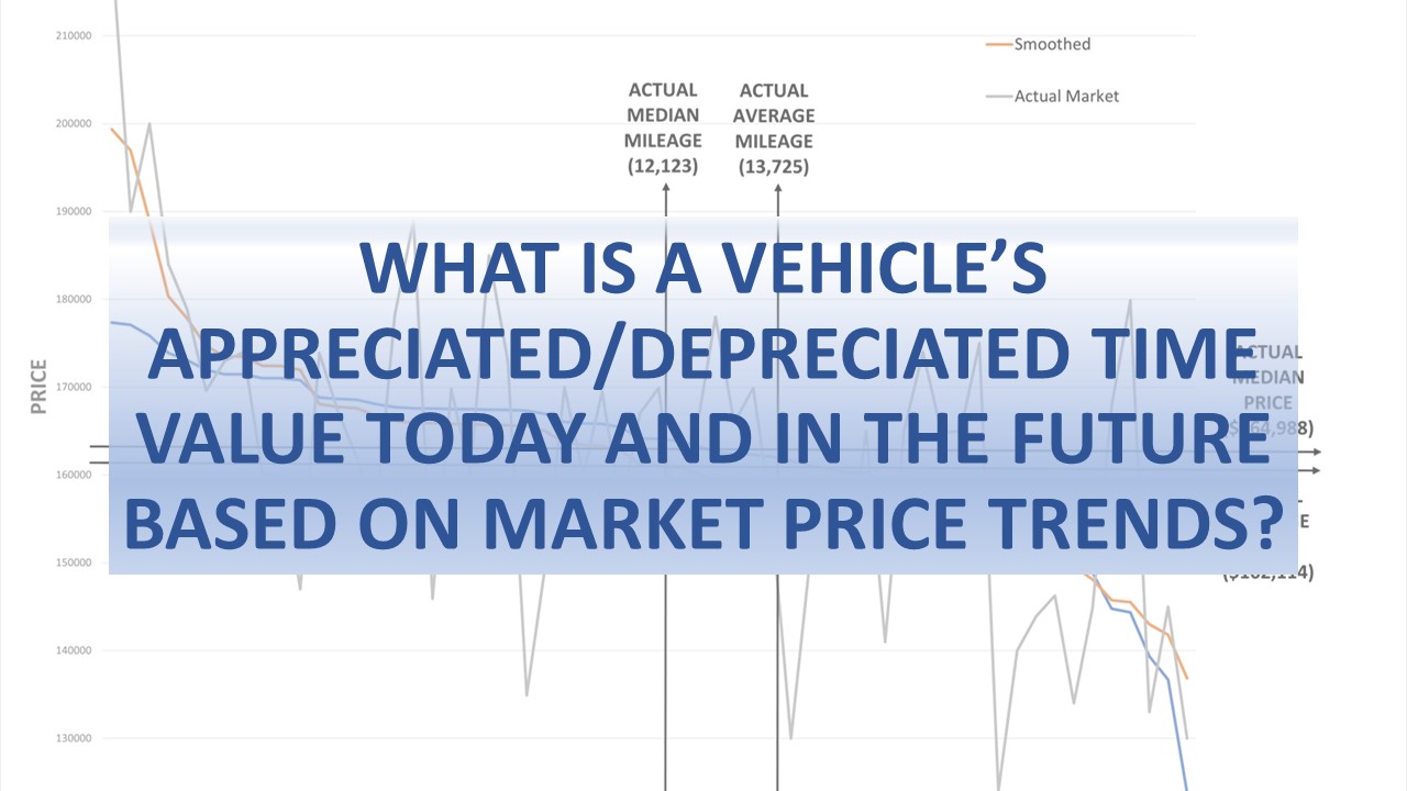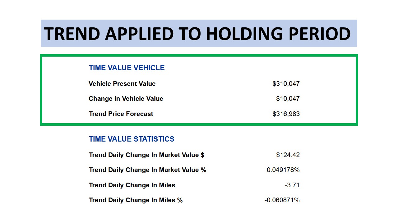 Similar in concept to calculating the present values of financial assets using interest rates, the app uses the market median price rate of change to assess the present value of a vehicle. To do this the app appreciates or depreciates a vehicle from a given price by applying a price trend to a stated price at the start of the submitted holding period. It also forecasts the price of vehicle at a future point in time using the same price trend rate of change. The app can also display the vehicle’s median price and mileage at any historical date.