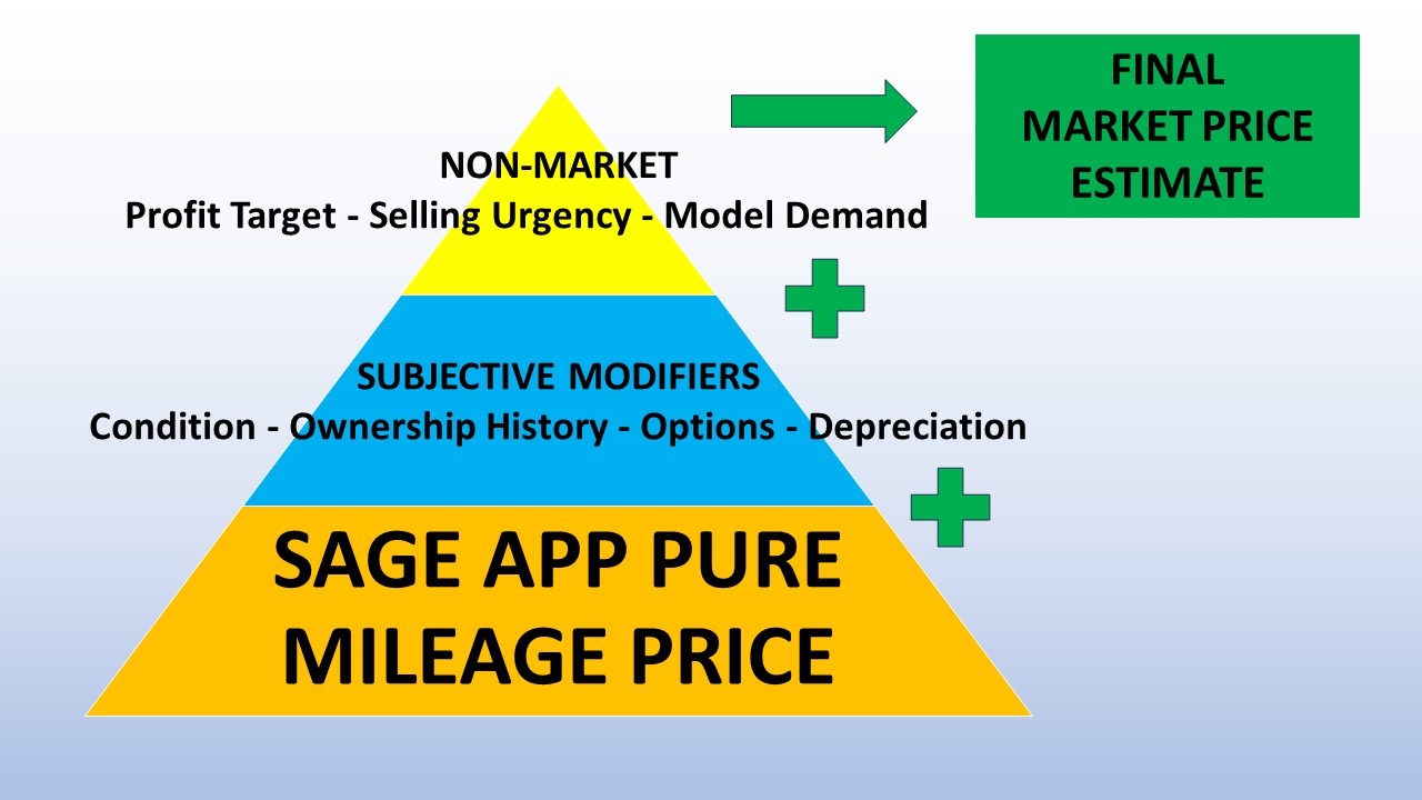 - The Sage Price app uses median mileage metrics to in two distinct pricing models to determine the ‘pure mileage’ base value of a vehicle given its mileage.