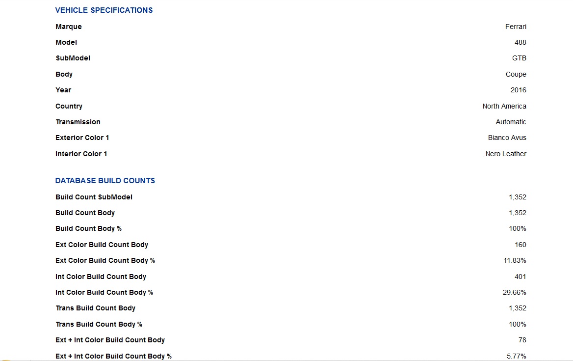 - Assess the relative rarity of the build spec starting with the number of vehicles built for the North American market all the way down to the number built in the color combination. Build counts include by body type and transmission type (if applicable).