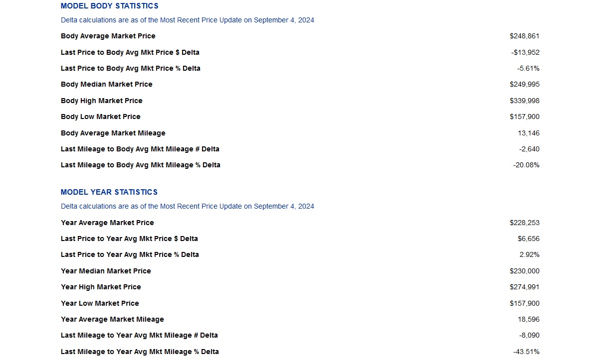 - Compare the last price and mileage to the market average and median overall or by model year.